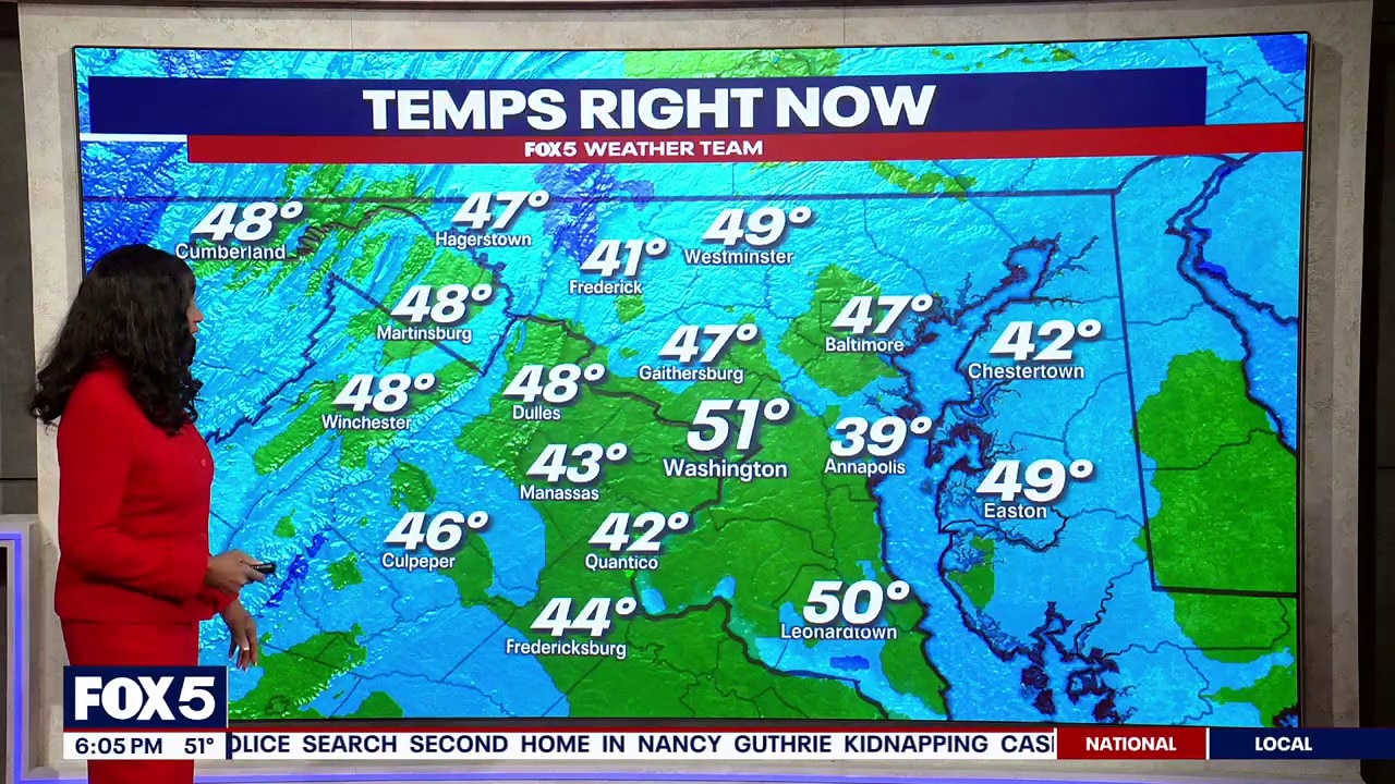A springlike Valentine’s Day gave the D.C. area highs in the upper 50s, but temperatures drop into the 30s overnight. Rain is expected to develop late Sunday morning and continue through the evening. Forecasters are also watching for a wintry mix on the northern and northwestern edge of the system — mainly areas north and west of the District — while most neighborhoods see plain rain. After a cooler start Saturday, temperatures trend milder again later in the week, with more rain chances possible midweek.