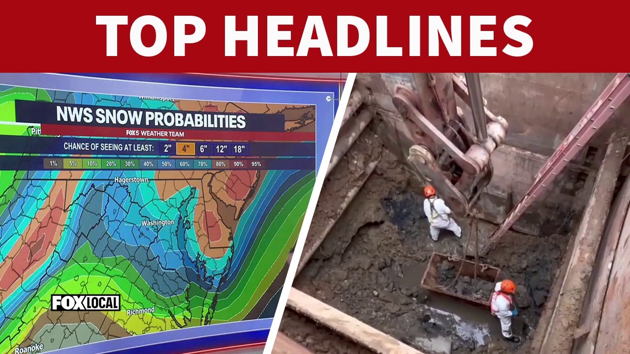 FOX 5's Caitlin Roth has the latest forecast for the snow expected on Sunday. Plus, DC officials held a press conference on the Potomac sewage cleanup, which is expected to cost at least $20 million.