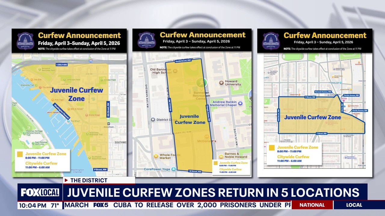 Tonight, five juvenile curfew zones are in effect in the District. This comes less than two weeks before the legislation that allows for the zones expires. FOX 5’s Josh Rosenthal is live along U Street in Northwest with more on where things stand now.