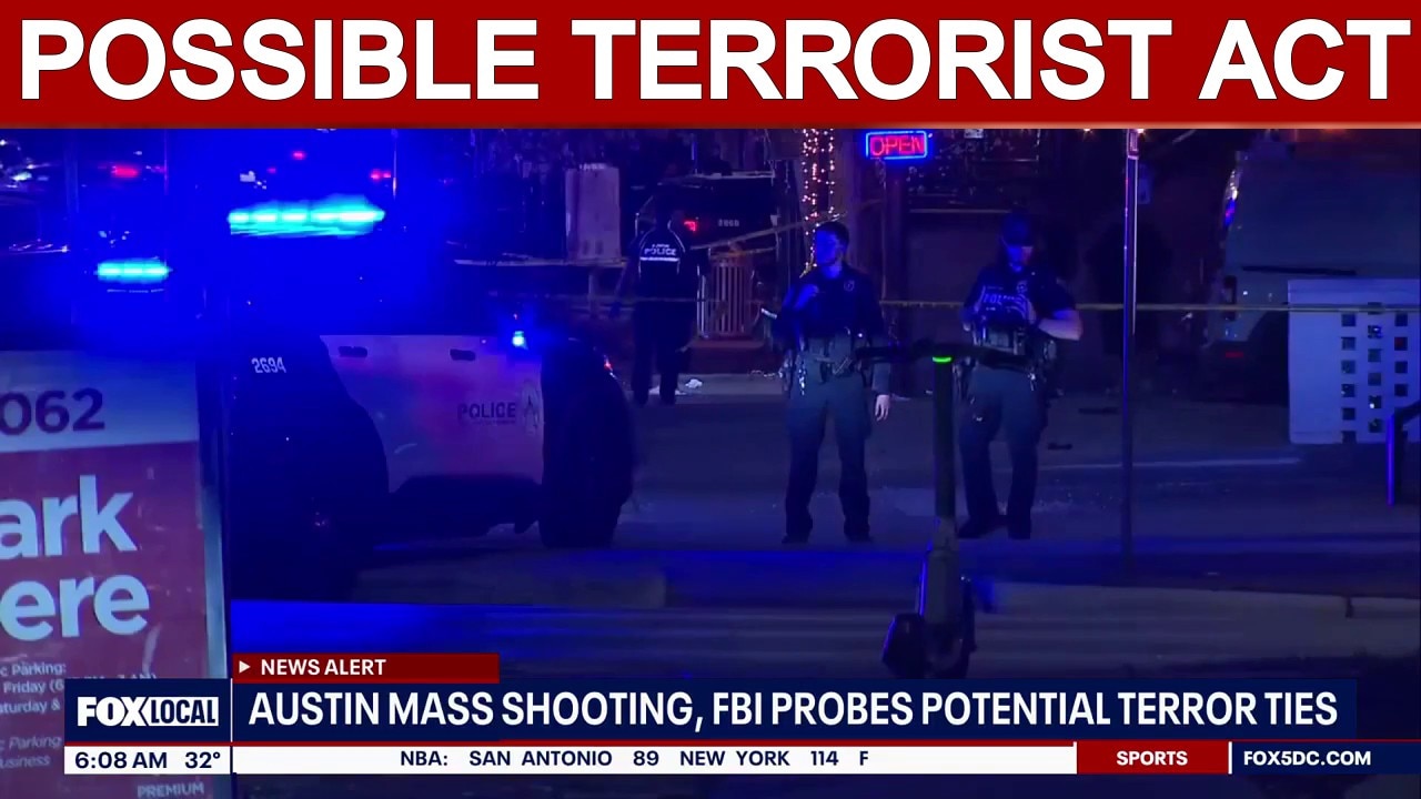 Authorities say a gunman wearing clothes with an Iranian flag design and the words "Property of Allah" killed two people and wounded 14 at a Texas bar. The FBI said the shooting in Austin is being investigated as a potential act of terrorism.