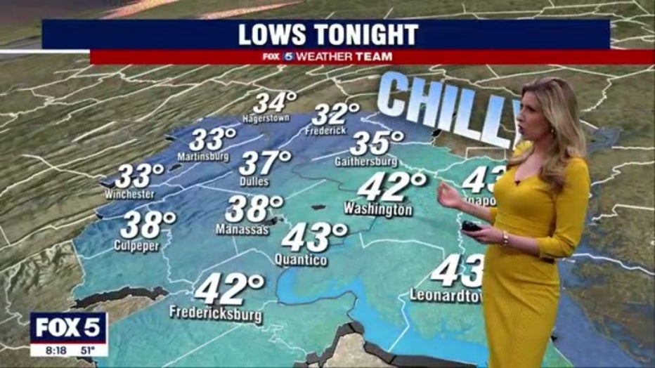 The unseasonably cool weather will hang around the area for the first part of this week. Sunday night low temperatures will fall into the mid 30s and lower 40s for the immediate D.C. region.