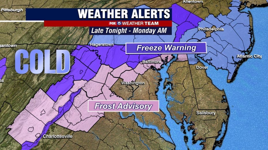 Parts of north and northwest Maryland will be under a Freeze Warning starting at 12 a.m. Monday morning. The impacted areas include Frederick and Carroll Counties, and parts of Baltimore, Harford, and Howard Counties. A frost advisory will also be in effect for parts of Maryland and Virginia. The warning and advisory will be in effect until 9 a.m. Monday.