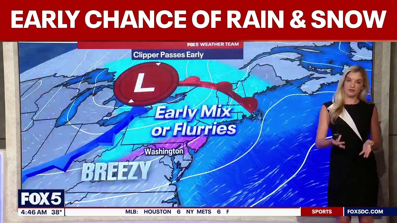 WASHINGTON - A brief mix of rain and snow is possible early Wednesday before the D.C. region turns milder and breezy this afternoon.