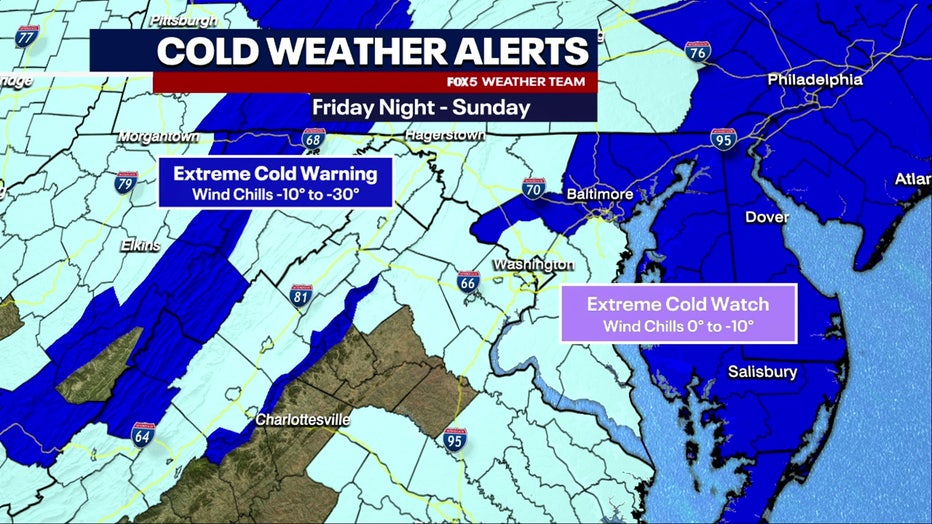 The incoming Arctic blast has prompted a Cold Weather Advisory and a High Wind Warning for D.C., much of Maryland, and northern Virginia. Wind chills could drop as low as 15 below zero, and gusts up to 60 mph are possible.