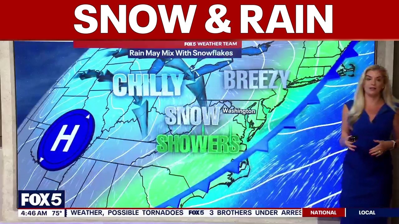Rain showers move in from the west during the morning and continue into early afternoon. As colder air rushes in behind a cold front, a few wet snowflakes may mix around midday. FOX 5’s Tucker Barnes says most of it will melt on contact, so road impacts are unlikely.