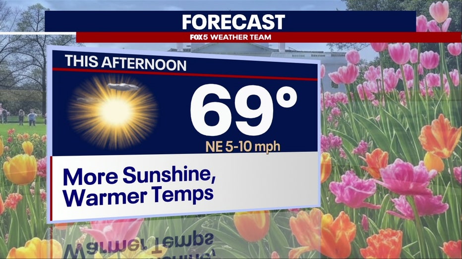 WASHINGTON - Monday brings mostly clear skies and warmer temperatures near 70 degrees before a stretch of wet weather moves into the Washington, D.C., region by midweek.