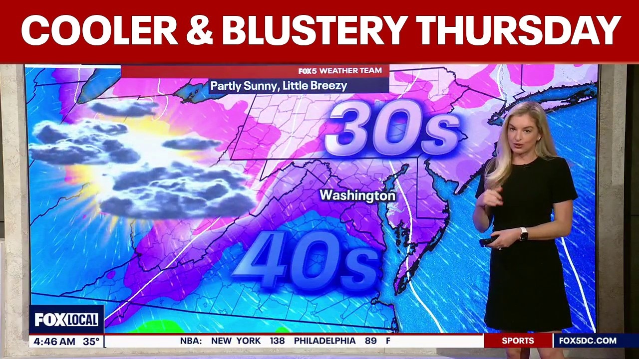 A cooler and blustery Thursday across the Washington, D.C. region on Thursday.