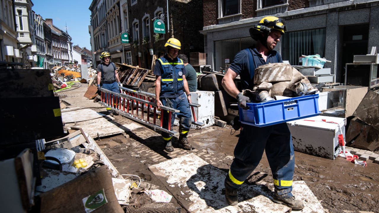 Helpers from the German Federal Agency for Technical Relief (THW) walk through a formerly flooded street where debris is now piled up. (Photo by Marius Becker/picture alliance via Getty Images)