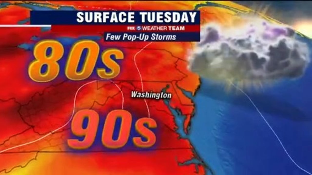 WASHINGTON - The heat continues Tuesday and so does the chance for scattered afternoon and evening storms.