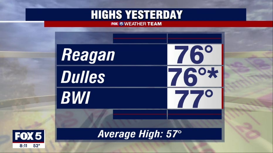 High temperatures Sunday will be in the upper 50s and low 60s. It will be much cooler than Saturday’s record high of 76 degrees at Dulles.