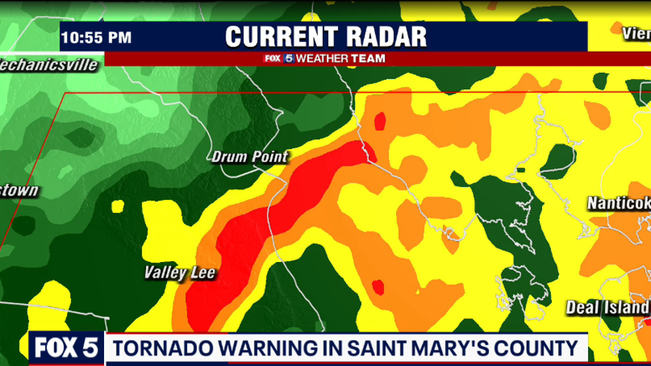 A tornado warning has been issued for parts of St. Mary's County until 11 p.m.