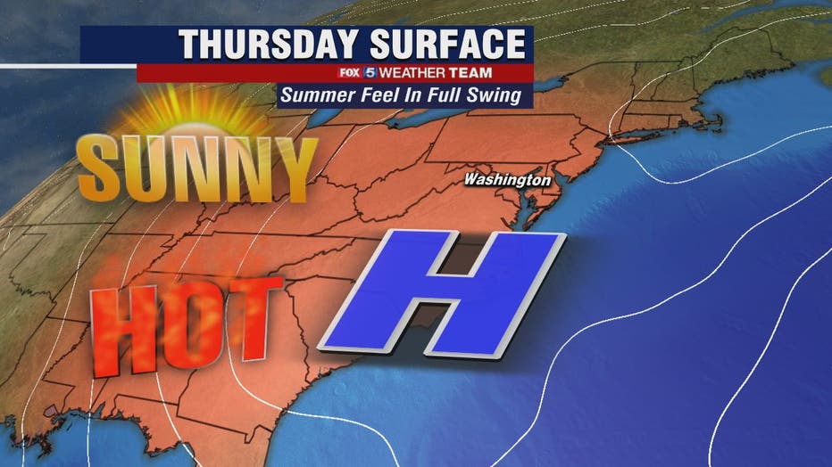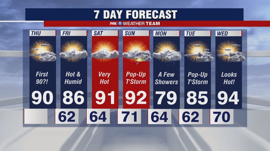 WASHINGTON - Our summer preview continues Thursday and it looks like our first heat wave of 2021 will last into the weekend. FOX 5's Sue Palka says the morning is reasonably cool and the humidity won't be too uncomfortable today as we head for the upper 80s by midafternoon.