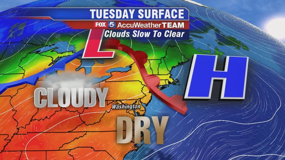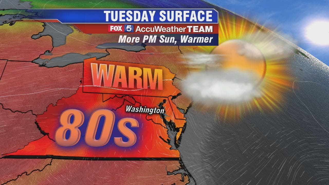 FOX 5's Sue Palka says morning clouds look to hang tough but as we break up some of that cloud cover in the afternoon temperatures soar into the mid-80s with the help of southerly winds.