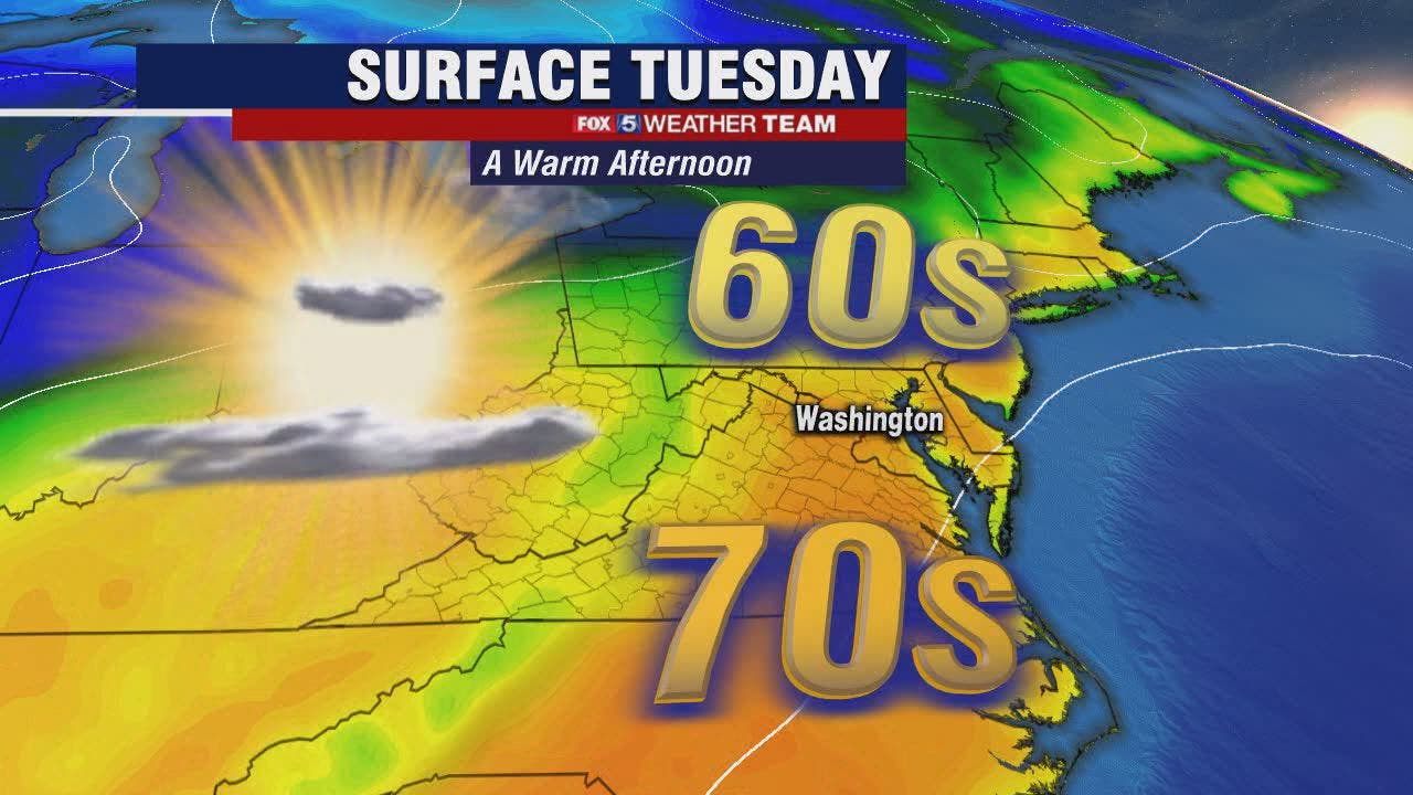 WASHINGTON - No showers or clouds to greet you Tuesday morning as a ridge of high pressure sets us up for a day of abundant sunshine! FOX 5's Gwen Tolbart says to get ready for the day that will be the "pick of the week" as temperatures rise to the mid-70s. What a treat!