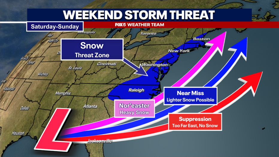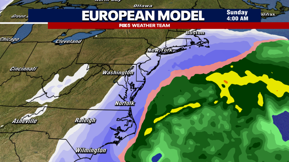 WASHINGTON - As of Wednesday evening, no weather model is showing a snow event for the D.C. area this weekend comparable to what we just experienced. Forecasters are still monitoring the system closely, but most guidance currently favors a near miss or a complete miss for our region.